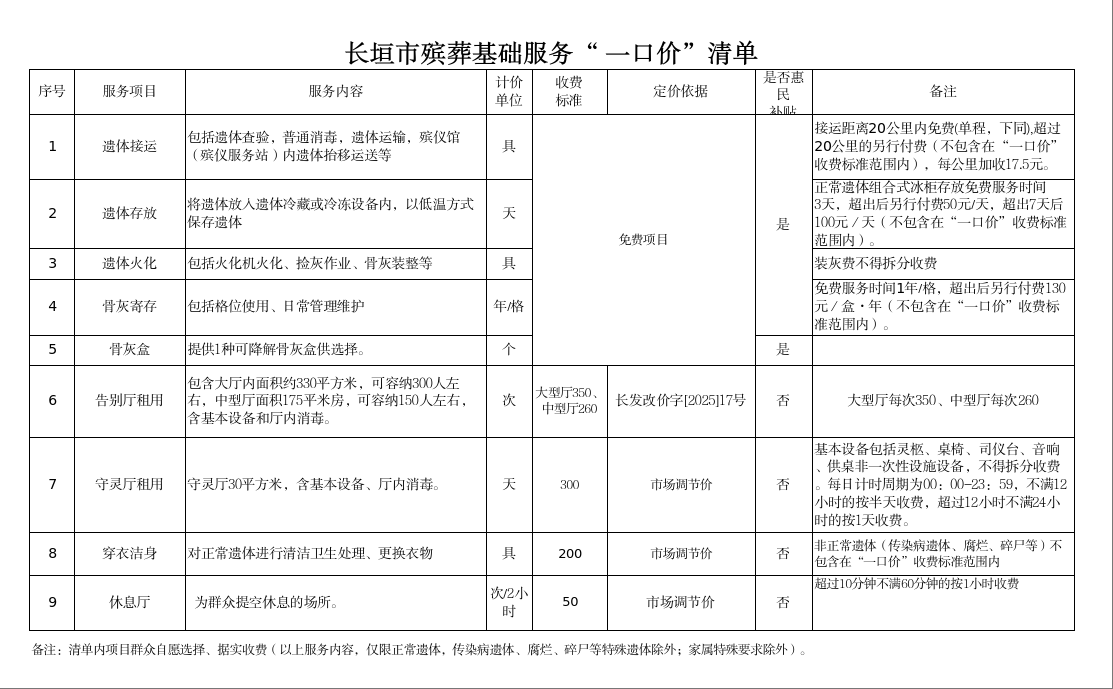 長垣市殯葬基礎服務“一口價”清單、長垣市殯葬基礎服務流程圖