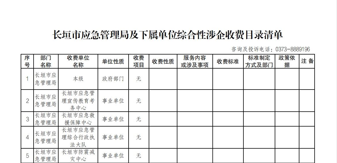 長垣市應急管理局及下屬單位綜合性涉企收費目錄清單